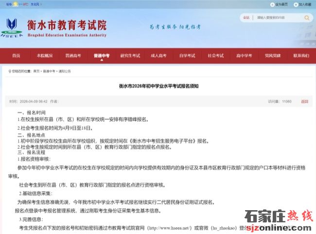4月9日至18日辦理報名信息,逾期不再辦理。參加2026年初中學(xué)考的考生應(yīng)具有衡水市戶籍或初中學(xué)籍(學(xué)歷)。九年級(2023級)學(xué)生為2026年畢業(yè)的學(xué)生。具有衡水市戶籍,在外?。ㄊ?、自治區(qū))、市就讀,且取得外?。ㄊ?、自治區(qū))、市學(xué)籍的初中應(yīng)屆畢業(yè)生需持其就讀學(xué)校的應(yīng)屆學(xué)籍證明,在其戶籍所在縣區(qū)招生考試部門報名。在衡水市無學(xué)籍、無戶籍的進(jìn)城務(wù)工人員及其他非戶籍就業(yè)人員隨遷子女可持居住證或父母就業(yè)證明和考生應(yīng)屆學(xué)籍證明在當(dāng)?shù)乜h區(qū)招生考試部門按應(yīng)屆生報名;若無應(yīng)屆學(xué)籍證明,則按往屆生報名。;八年級(2024級)學(xué)生為預(yù)計2027年畢業(yè)的學(xué)生。社會考生到所在縣(市、區(qū))教育行政部門指定的報名點進(jìn)行資格審核。八年級學(xué)生報名時間為2026年