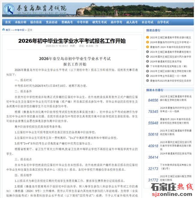 2026年秦皇島中考報(bào)名時(shí)間確定,