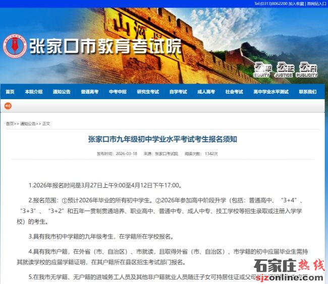 2026年張家口中考報(bào)名時(shí)間確定,